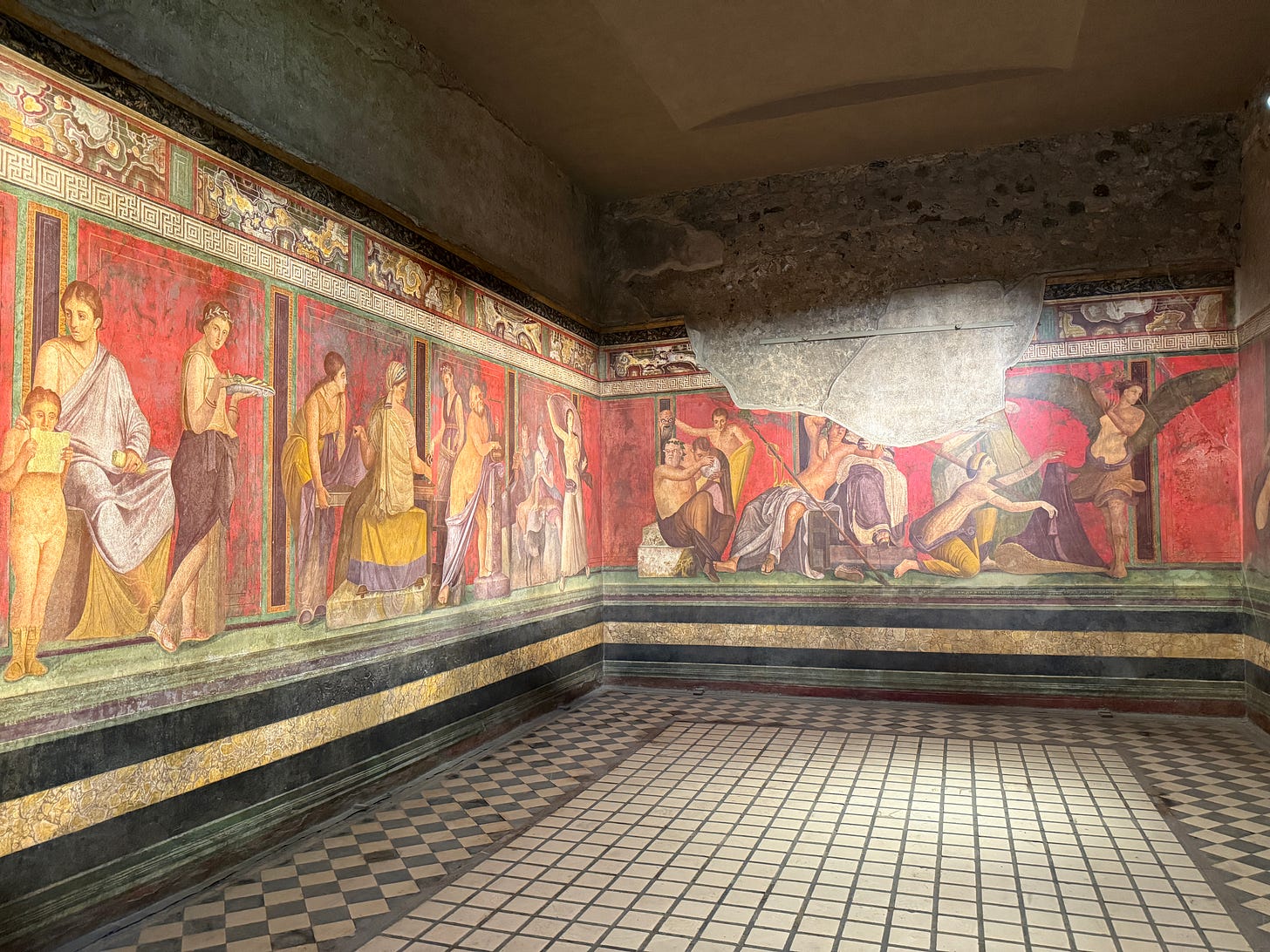At the end of a long, hot day walking in its ruins, we found ourselves in the Villa of the Mysteries, where we were enchanted by a well-preserved fresco devoted to a Dionysian cult.