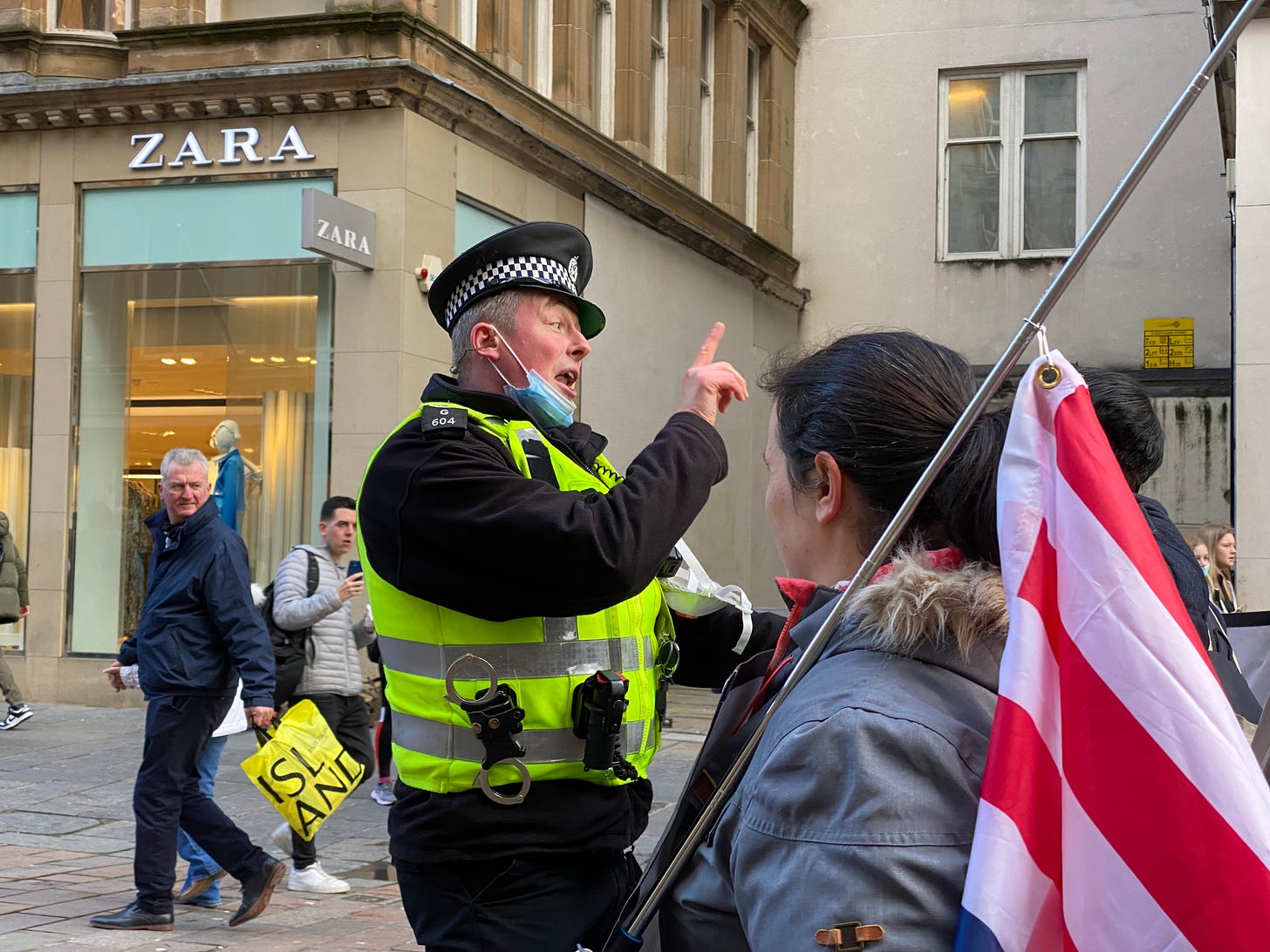 14 July 2021. A masked policeman arrests someone in St Enoch Square.
