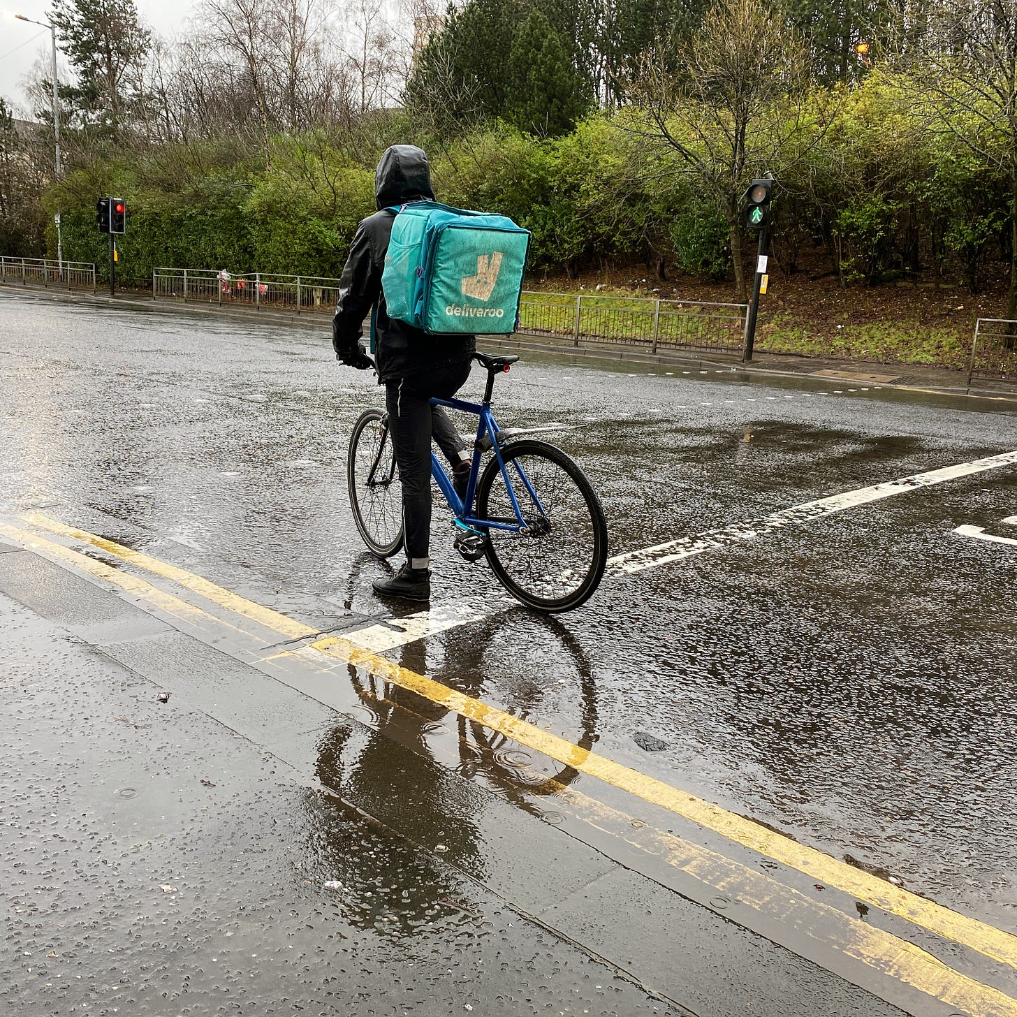 26 January 2021. A Deliveroo cyclist endures rain in order to keep the fast food economy going.