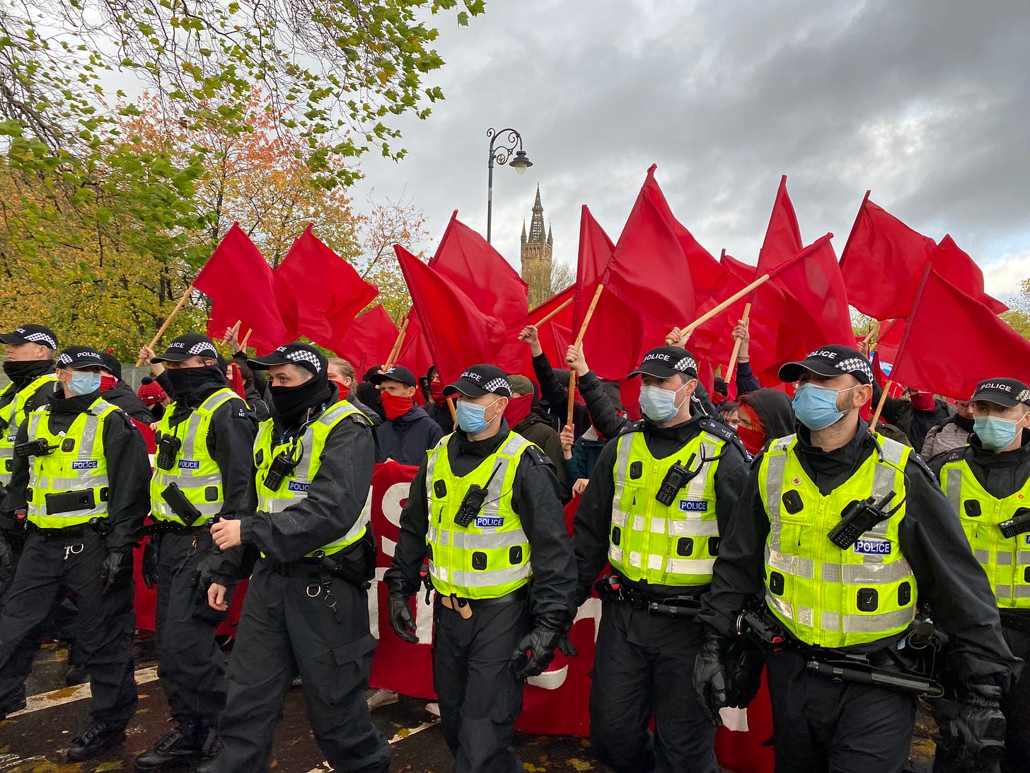 6 November 2021. COP26 protest. The red flags and the blue mask.