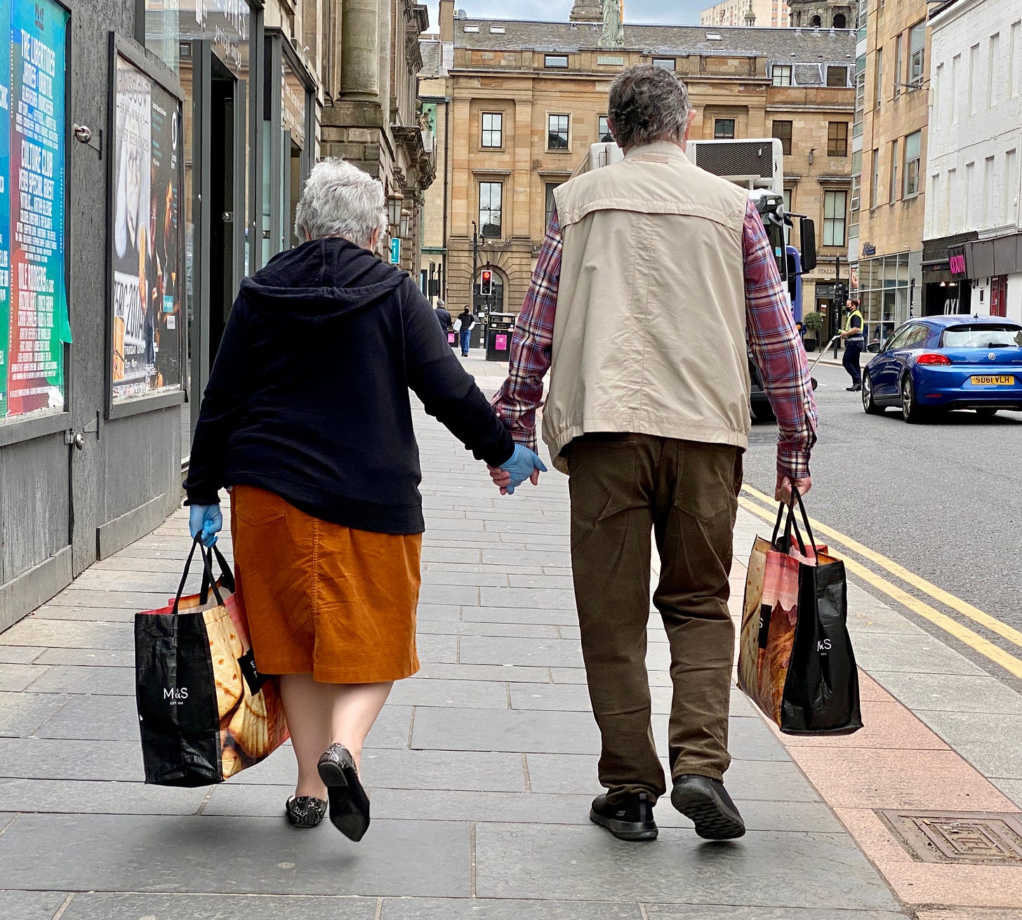 8 June 2021. A couple holding hands, one wearing rubber gloves.