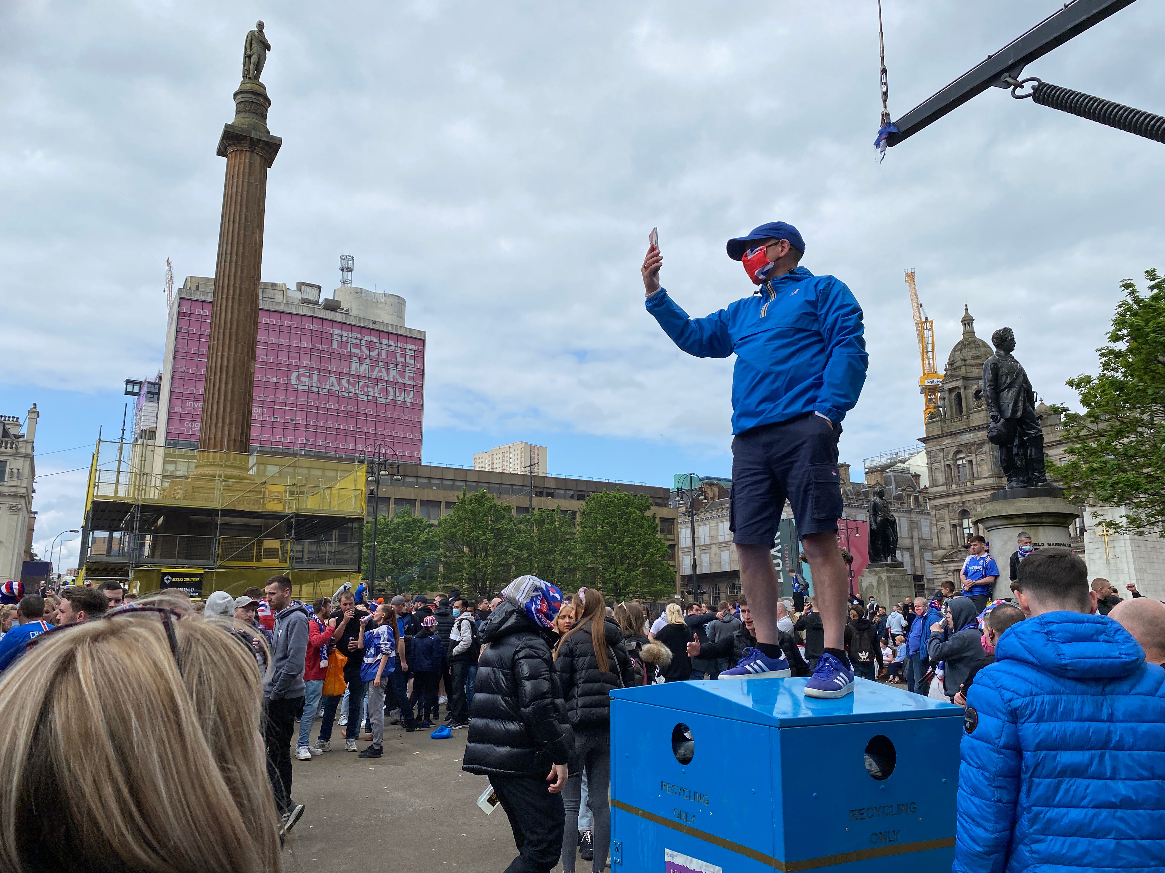 15 May 2021. Rangers fans celebrate winning the league. Not many masks were being worn, but I did spot one guy.