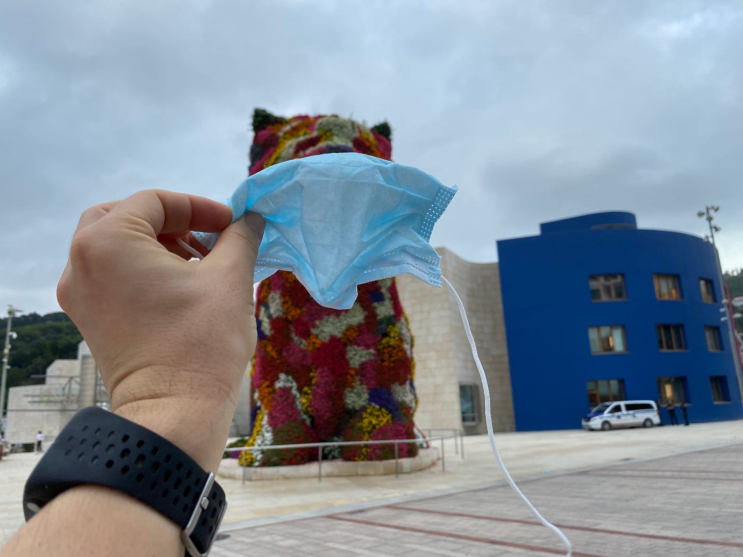 9 July 2020. I add a broken mask to Jeff Koons’ Puppy in Bilbao.