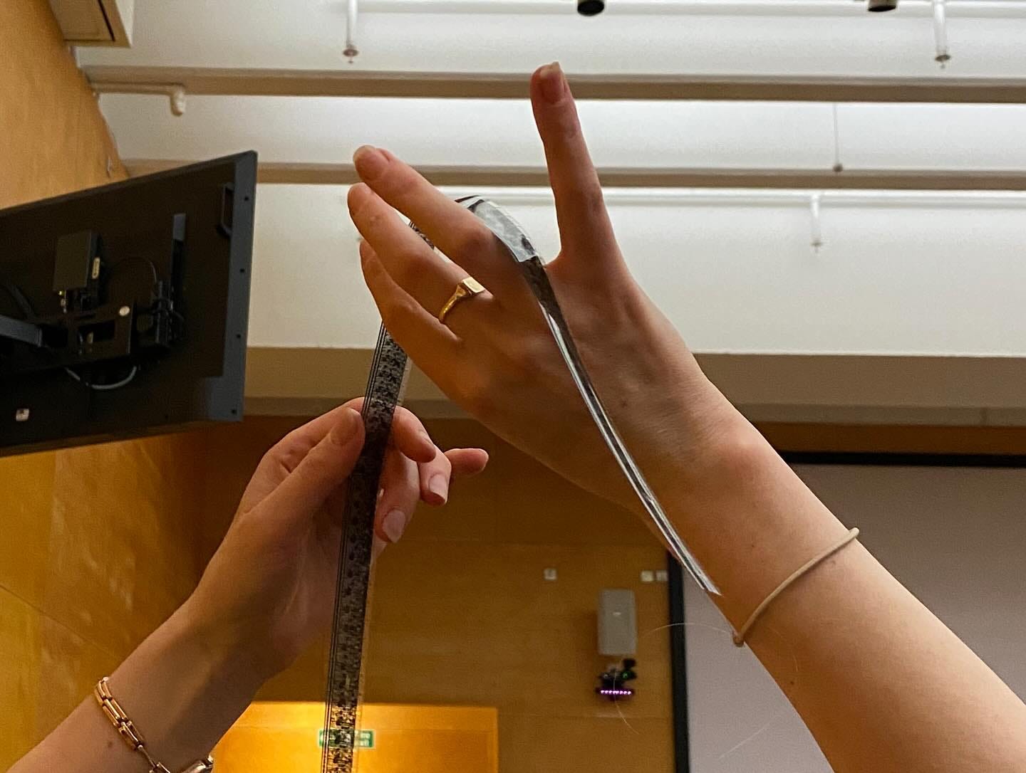Johanna inspects film as Esther Kinsky had a mellow, fruitful talk with Anne-Marie Copestake at the Art Writing event.