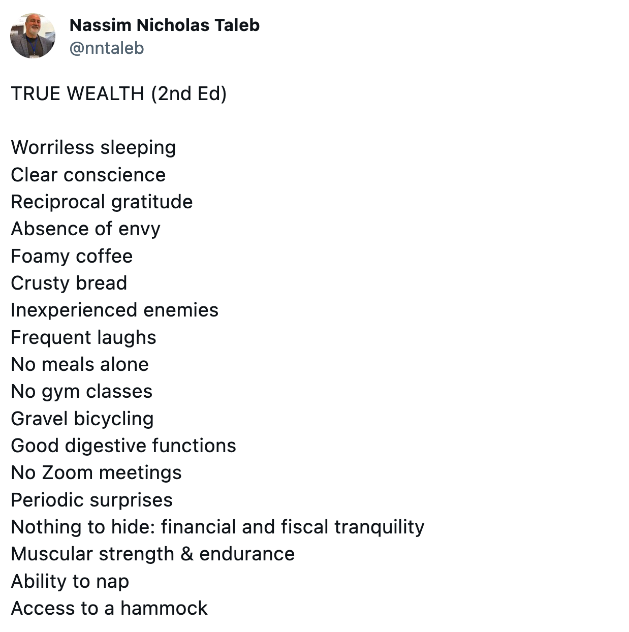 I mentioned in my post on routines that it doesn’t matter how much you plan, your routine will come to nothing if you don’t sleep well. I took this idea from Nassim Taleb who has an extended list of things that make a good life.