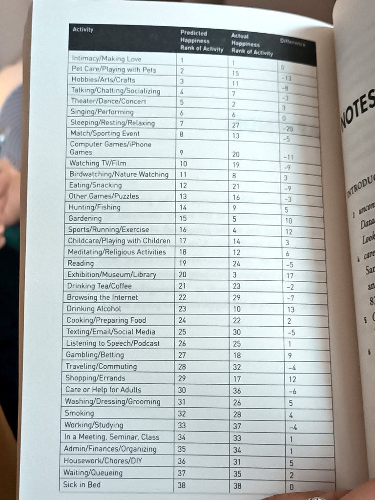 I chanced upon Aveek Bhattacharya’s review of Seth Stephens-Davidowitz’s Don’t Trust Your Gut and liked this table ranking what people think will make them happy versus what actually makes people happy. For instance, going to an Exhibition/Museum/Library was ranked 20th in predicted happiness but came 3rd when people actually experienced it.