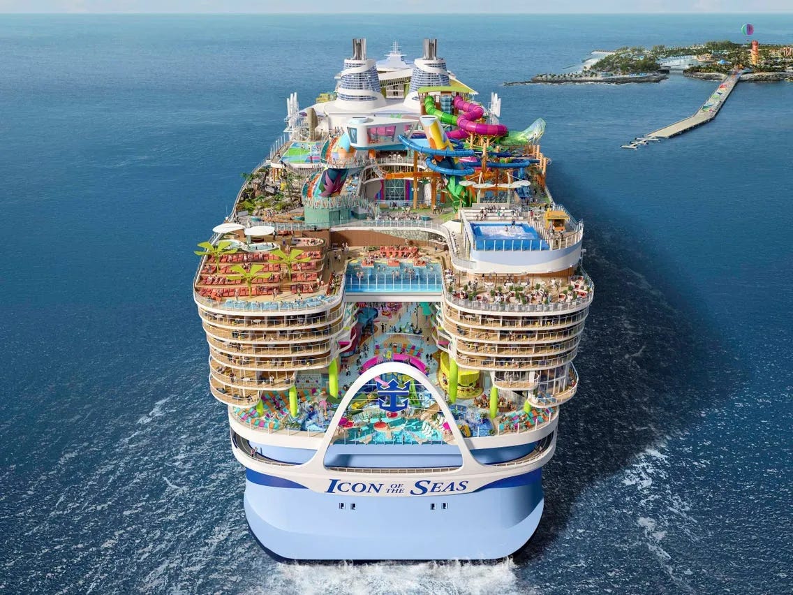 If you boiled the spirit of the modern hospitality business down to its purest concentrate, you surely get something like the Icon of the Seas, the enormous new cruise ship whose digital renderings have recently gone viral online. Imagine Hieronymus Bosch painting Disneyland, and you get some sense of the diabolical energy of this project. I can think of no other artefact that employs design, engineering and industrial capacity on this scale for the sole purpose of escapism and pleasure.