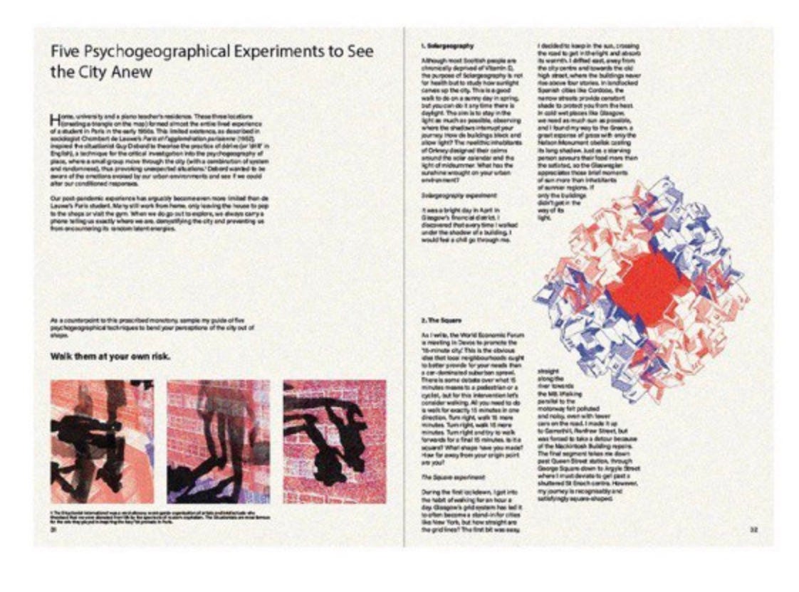 The Edinburgh-based architecture magazine, Crumble, is launching its eighth issue in September. The issue is titled ‘Bending out of Shape’ and contains an article I wrote on seeing the city anew with psychogeography. Pre-order here.